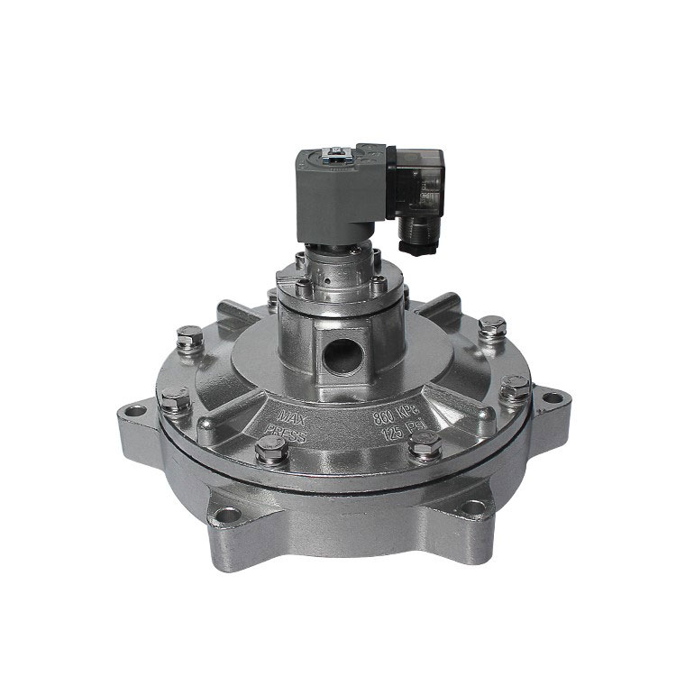Consta de un cabezal piloto electromagnético, un conjunto de diafragma (diafragma, resorte de presión, sello) y cuerpo de válvula. Instalado sumergido dentro del depósito de aire, se conecta al depósito mediante una brida. El puerto de salida está ubicado centralmente dentro del cuerpo de la válvula dentro del depósito y se extiende a través de componentes como un dispositivo que penetra la pared para ingresar a la cámara de soplado para su operación. Este tipo de válvula presenta un diseño de canal de flujo optimizado que reduce efectivamente la resistencia al flujo de gas, asegurando un funcionamiento estable incluso en condiciones de baja presión. Este diseño reduce el consumo de energía y prolonga la vida útil del diafragma.